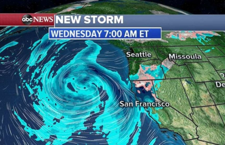 (ABC News) A storm is gathering off the West Coast on Wednesday morning.By Thursday, part of that storm will bring rain to the flooded areas on Missouri and Mississippi rivers, while more rain and snow will move onto the West Coast.