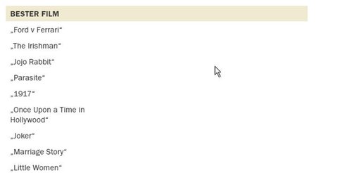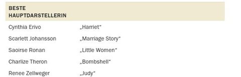 Die Trophäe für den besten Animationsfilm ging an den vierten „Toy Story“-Film „Alles hört auf kein Kommando“ von Josh Cooley; für das beste adaptierte Drehbuch wurde der Neuseeländer Taika Waititi für die Satire „Jojo Rabbit“ geehrt; den Oscar für das beste Kostümdesign erhielt Greta Gerwigs Romanverfilmung „Little Women“.