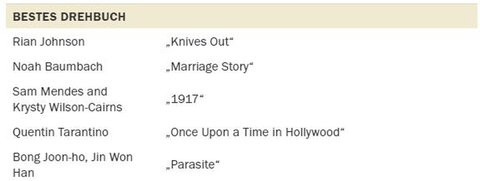 „Parasite“ gewinnt als bestes Originaldrehbuch, Brad Pitt ist bester Nebendarsteller