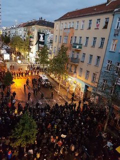 Es sind bereits Menschen festgenommen worden, es gab Flaschenwürfe auf die Polizei. Der Strom ist abgestellt worden.